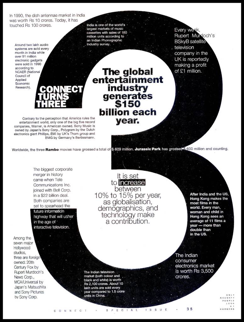 Connect introduced a disruptive and innovative distribution model to the staid and tightly controlled magazine distribution business. The launch issue bypassed news stands and was placed directly in video libraries and gift stores in Delhi. The instant acceptance by early adopters resulted in the brand going viral, so to speak, and eventually went nationwide via traditional distribution outlets. It goes without saying that the Nineties are considered India’s defining decade in which the country began to seek a new identity in the age of globalization. This was reflected in Connect’s updated brand mantra: ‘India’s Voice in the Global Village’.