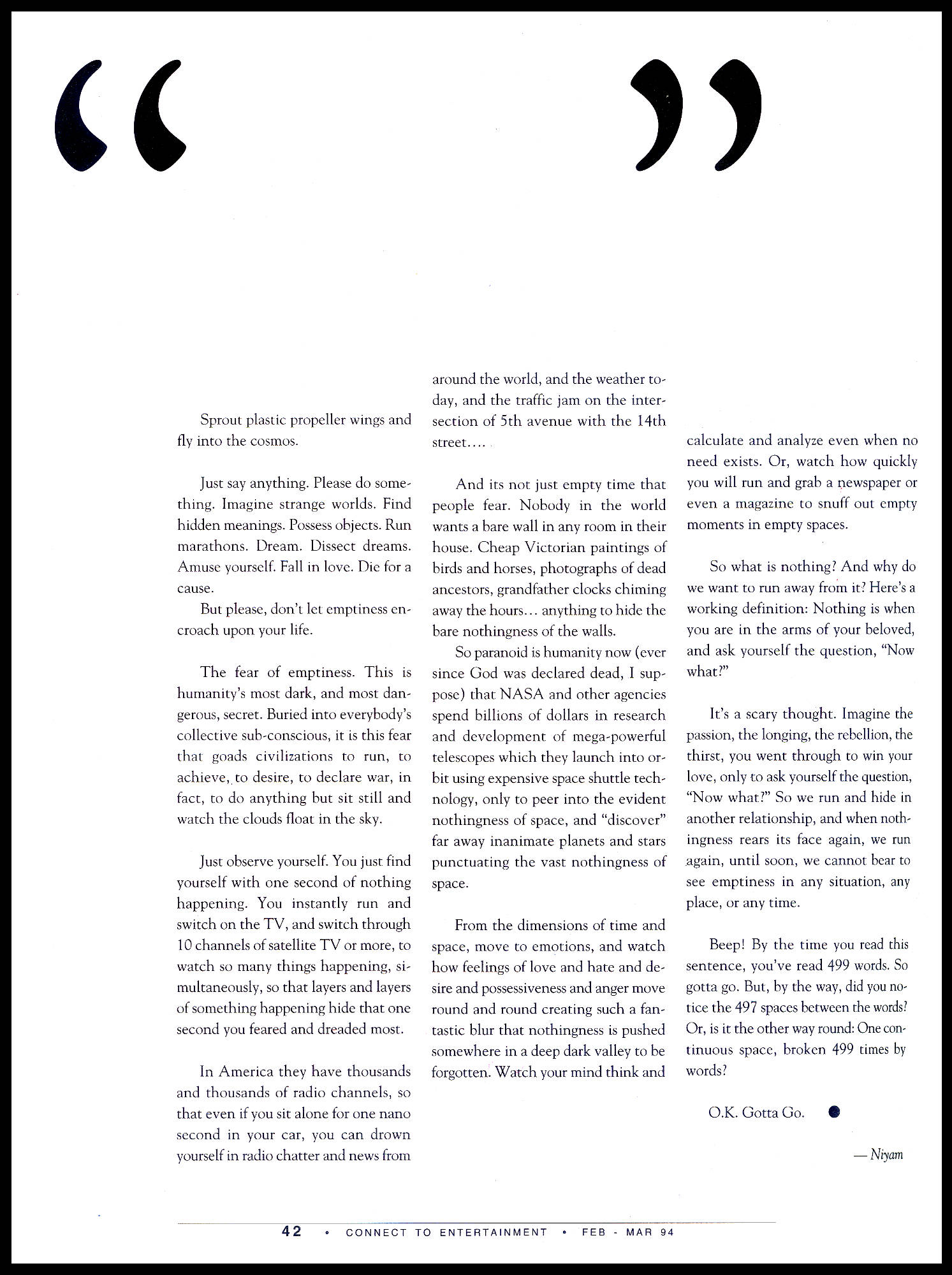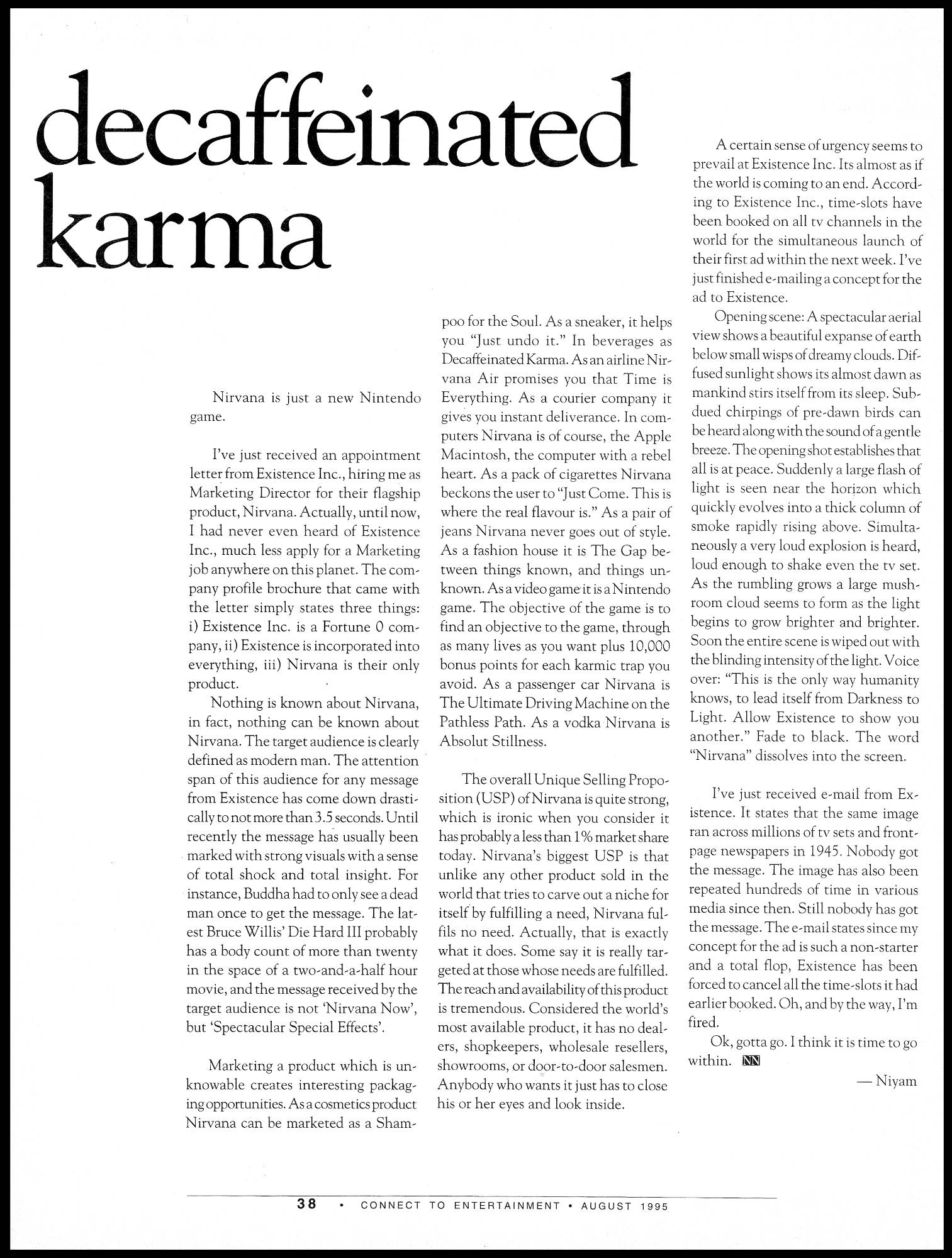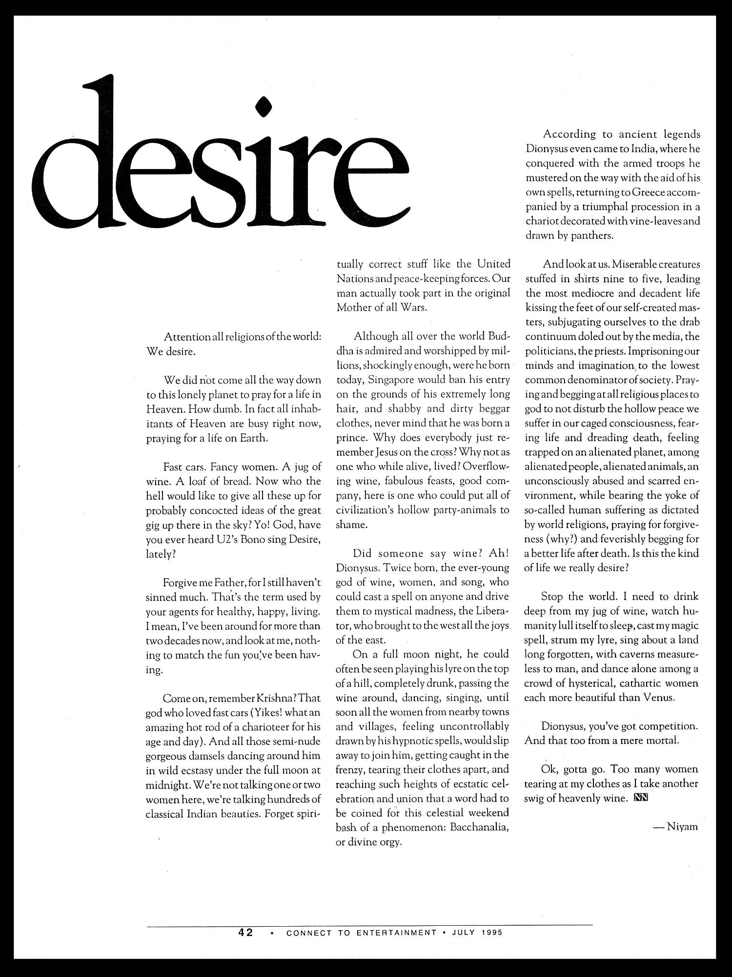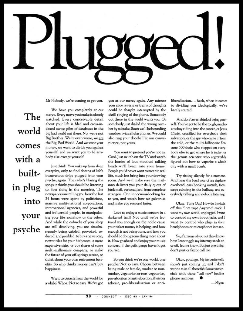 In addition to its innovative graphic design, Connect won over a loyal following for its famous back page column authored by Niyam Bhushan.