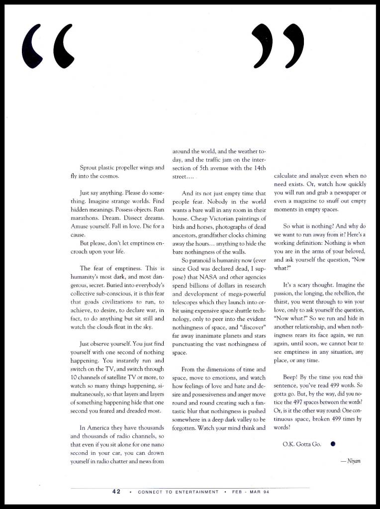 Connectment Films is the evolution of Connect Magazine which was co-founded by Nyay Bhushan, Niket Bhushan, Namrata B Durgan and Niyam Bhushan in November 1990. In the spirit of today’s startup culture, Connect launched as a Minimum Viable Product (MVP) in the form of a photocopied, stapled magazine designed on Apple Macintosh computers. Billed as India’s first magazine on global entertainment, Connect anticipated the tectonic cultural shifts that ended up defining the Nineties, just months before satellite television signals began beaming into India starting with CNN’s coverage of the Gulf War in 1991. The resulting explosion of entertainment channels coupled with the consumer boom fanned by the arrival of multi-national brands – thanks to India’s economic liberalization policies launched in 1991 – reinforced Connect’s vision of offering a unique Indian perspective on this paradigm shift in culture and lifestyle trends.