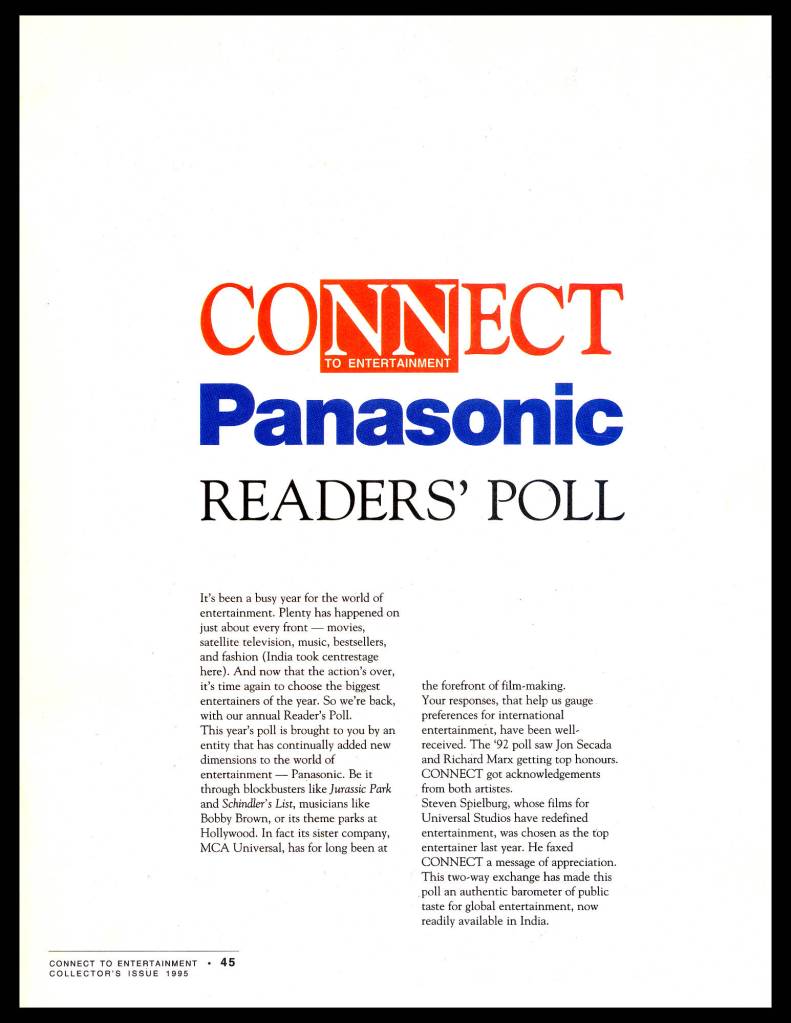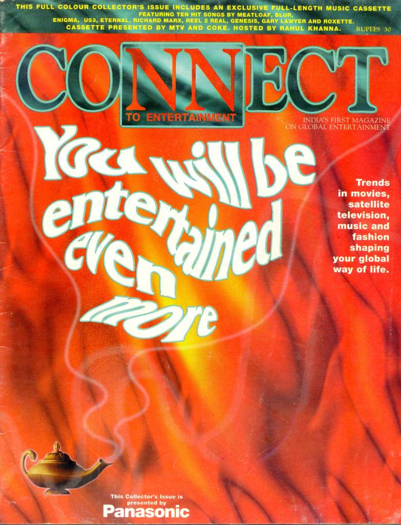 As part of its innovative approach in communicating the growing entertainment revolution of the decade, in 1995 Connect pioneered a unique collector’s issue which was packed with a specially curated audio cassette presented in association with MTV, Coca-Cola and HMV/EMI Records. The cassette featured 10 full length songs – the first time such a cassette was packed with any Indian magazine – featuring introduction links by MTV VJ Rahul Khanna who was the host of the popular request show MTV Most Wanted. Incorporating ground-breaking graphic design utilizing Adobe Photoshop, the issue was entirely sponsored by Panasonic as an extension of the Japanese giant’s launch campaign in India.