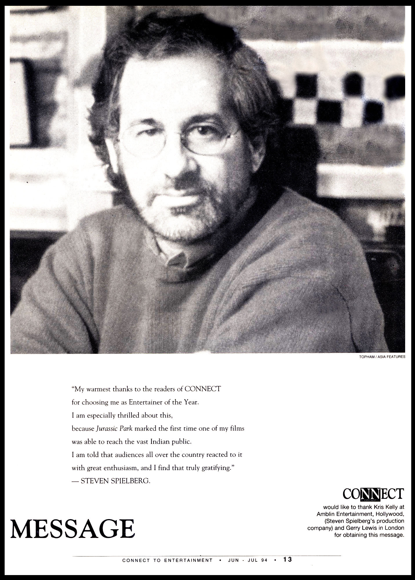 Steven Spielberg was voted Entertainer of the Year in Connect’s 1993 annual reader’s poll. So of course, Connect had to reach out to Spielberg for a message. And this is what he shared: