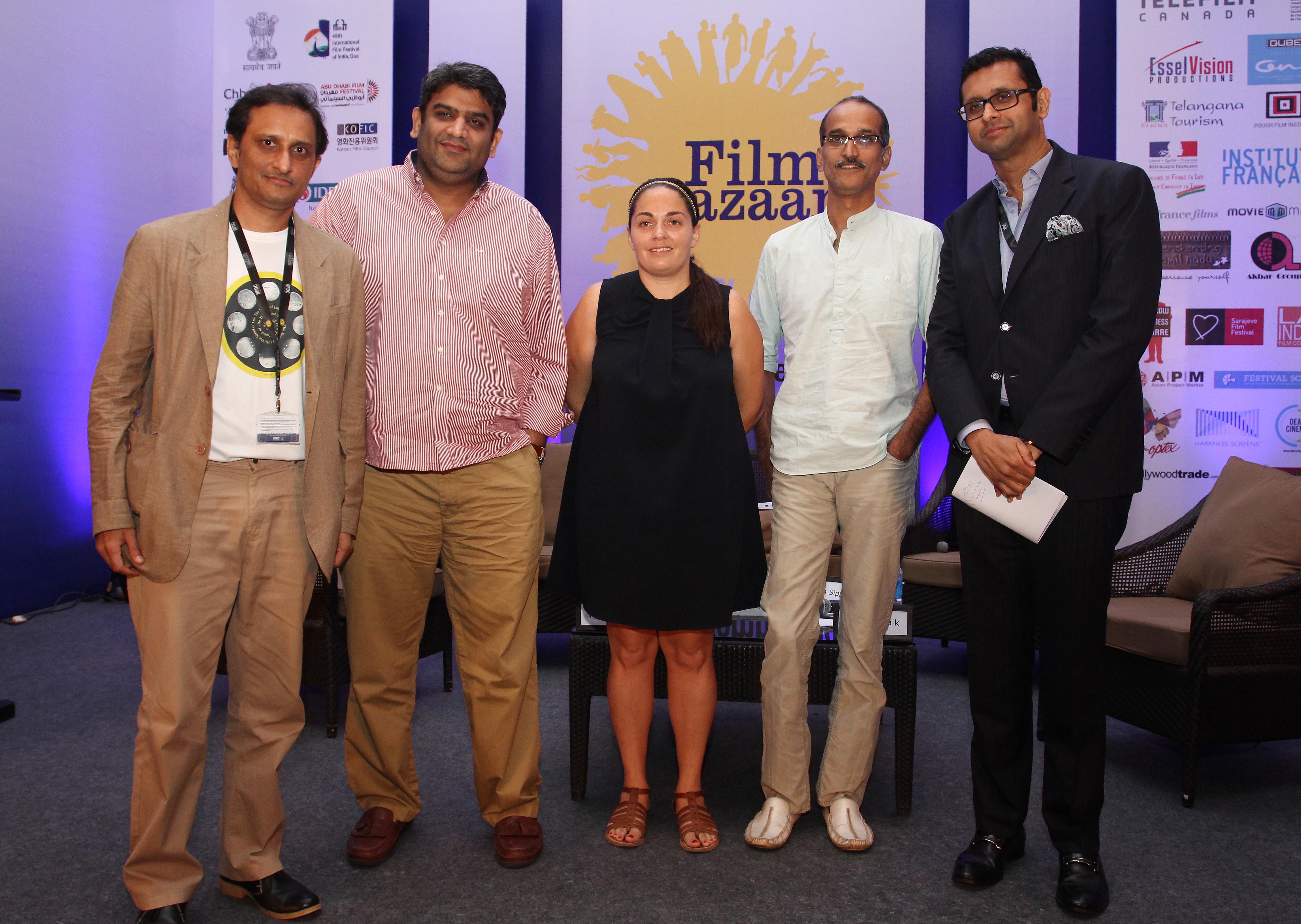 Knowledge Series 2014 – Remakes – Creative & Financial Viability: (L to R) Nyay Bhushan, Indian Correspondent – Hollywood Reporter, Amar Butala, COO, Salman Khan Ventures – India, Deborah Benattar, MD, La Fabrique Films, Bollywood filmmaker Rohan Sippy and Ameet Naik, Managing Partner, Naik Naik and Company during the Knowledge series 2014 session on remakes – Creative & Financial Viability at the 8th NFDC Film Bazaar 2014, held at the Marriott Hotel, Panjim, Goa, India on November 21, 2014. (Manoj Patil/SOLARIS IMAGES)
